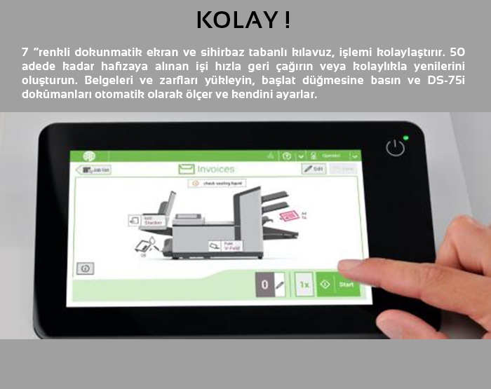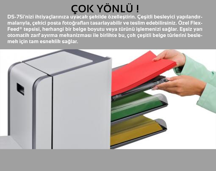 Kompakt bir alanda gelişmiş teknoloji olan DS-75i, herhangi bir orta ölçekli şirket için ideal katlama/Zarflama çözümüdür. Önemli iş iletişim gönderilerinizi hızlı ve güvenli bir şekilde işlemenizi sağlar.