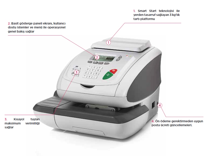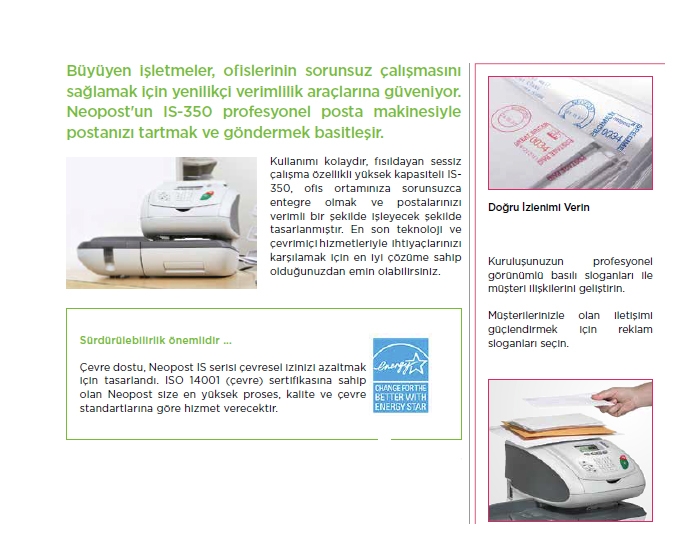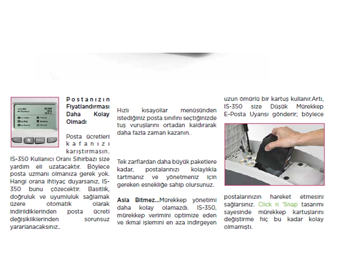 IS 350 ile PTT sunucusuna kolayca bağlanabilir ve bir kaç işlem ile kontör yükleyip, gönderinizin boyutları ne olursa olsun postalarınızı ücretlendirebilirsiniz. Gönderilerinizi besleme ünitesine bırakın, makine üzerinde yer alan başla tuşuna basın ve postalarınızı işlenmiş, ücretlendirilmiş son hali ile çıkış bölümünden alın! Neopost IS 350 makinesi dakikada 40 ücret damgası basabilmektedir. Makineye entegre 3 kg lık terazi ile paketlerinizi de kolayca işleyebilir, ücretlendirebilirsiniz.